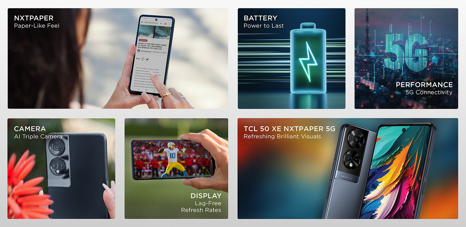 The TCL 50 XE NXTPAPER 5G is powered by NXTPAPER® technology to take experiencing your favorite sports, shows, and apps to the NXT level.