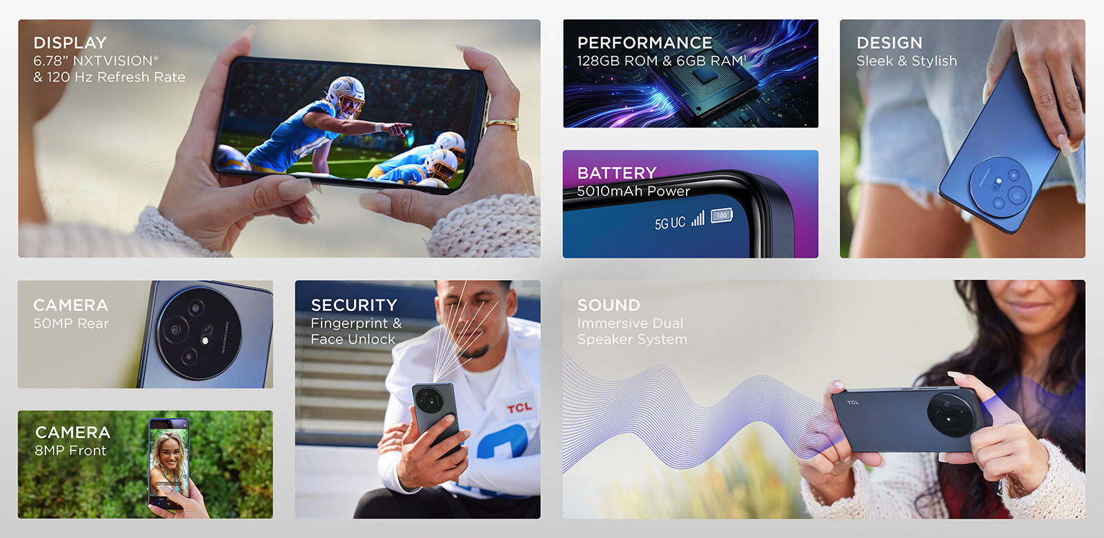 The TCL 50 XL 5G is powered by a 6.78” FHD+ display with NXTVISION® technology and dual speakers to take experiencing your favorite sports, shows, and apps to the next level.
