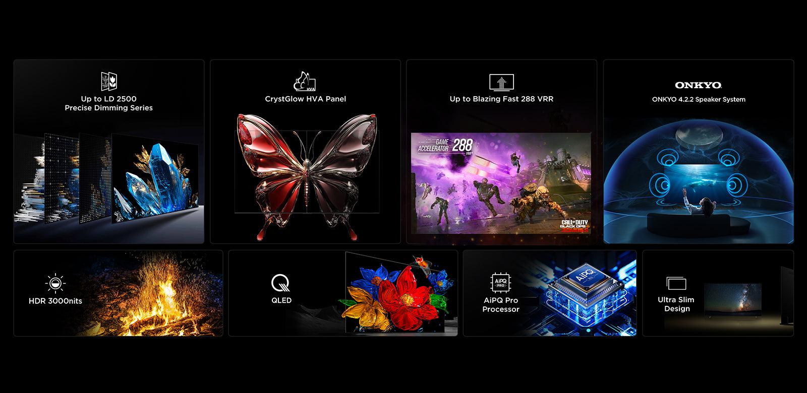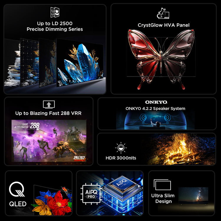 Precise Dimming series refers to Mini LED TV with all-domain halo control technology. The new generation of powerful light-emitting chip, super condensed Micro lens and Micro-OD make the light shape of individual zones more perfect, and its halo control ability is several times that of ordinary zones. Combined with the HVA panel with higher native contrast ratio and the world's leading light and shadow control algorithm, Precise Dimming series shapes the real light and shadow so that the TV's comprehensive picture quality performance is dramatically improved compared to ordinary TVs, bringing an upscale image experience.