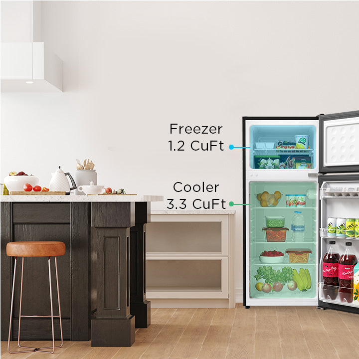1.2 CuFt Capacity in Freezer and 3.3 CuFt Capacity in Cooler provides ample space for all your items.