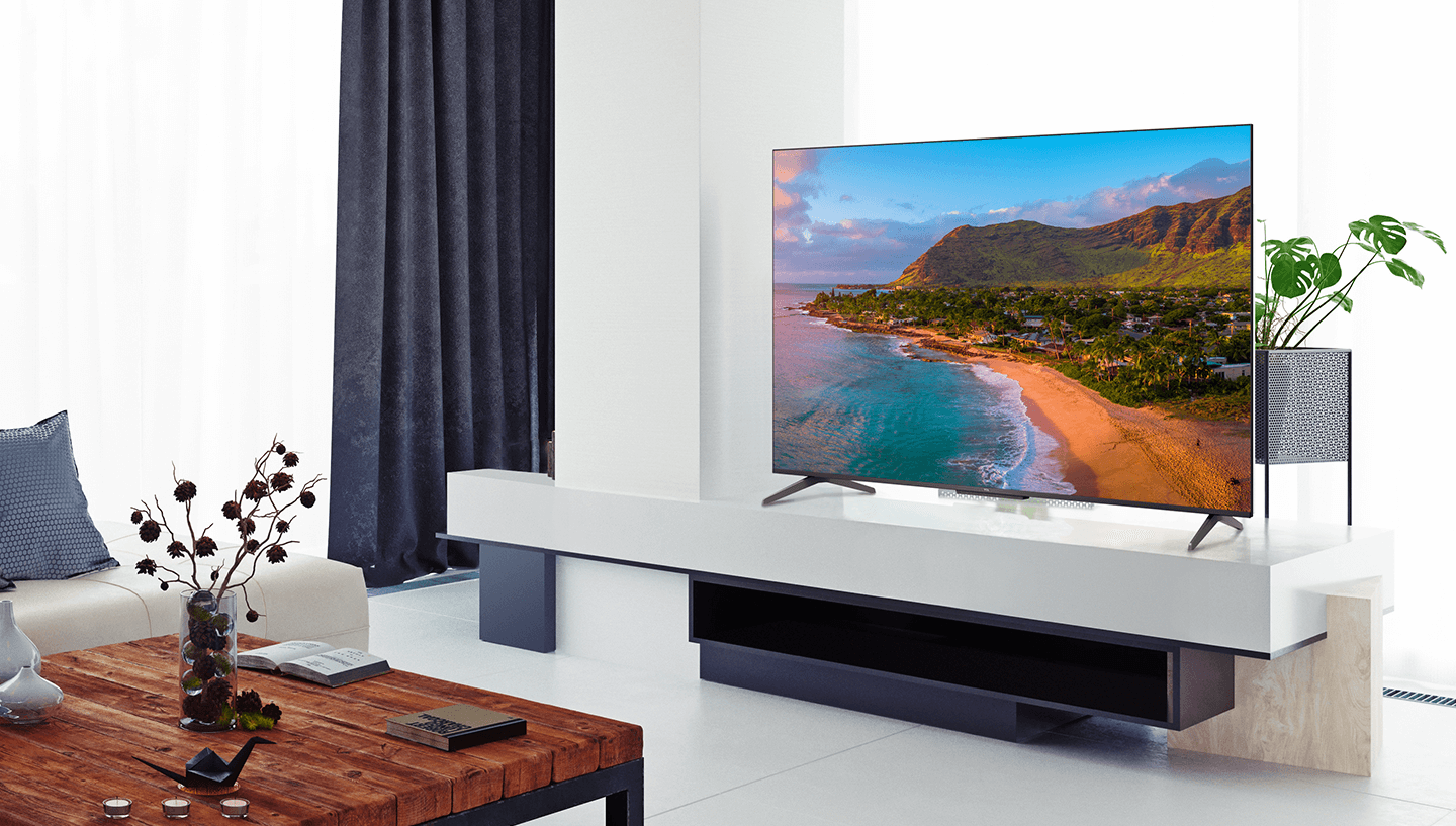 A seamless, edge-to-edge glass display, dark finish, and slim profile, lets you feel the power and refinement before you even turn it on. An integrated cable management system makes your TV setup clutter-free. Easily fit your TV to your room with the adjustable, two-position feet available on larger models.¹