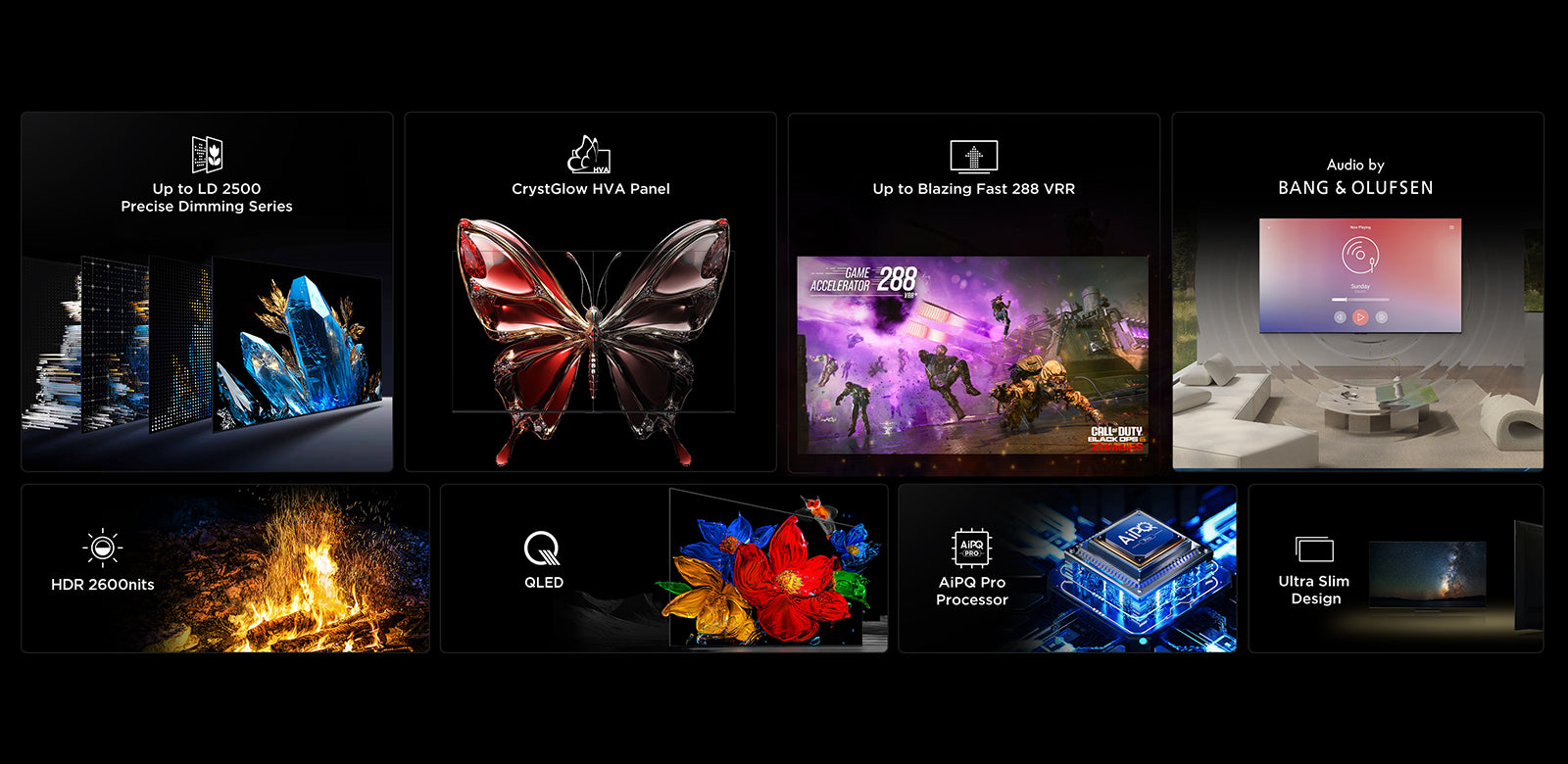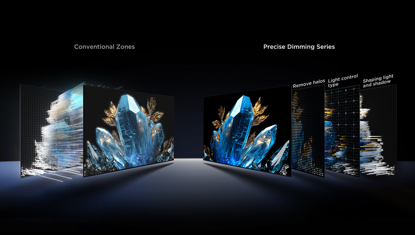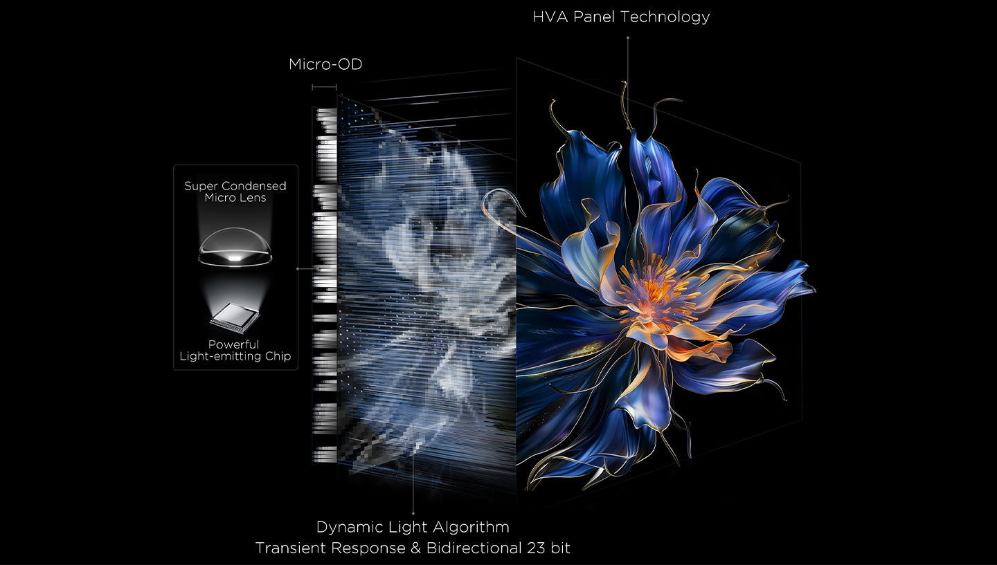 Precise Dimming series refers to Mini LED TV with all-domain halo control technology. The new generation of powerful light-emitting chip, super condensed Micro lens and Micro-OD make the light shape of individual zones more perfect, and its halo control ability is several times that of ordinary zones. Combined with the HVA panel with higher native contrast ratio and the world's leading light and shadow control algorithm, Precise Dimming series shapes the real light and shadow so that the TV's comprehensive picture quality performance is dramatically improved compared to ordinary TVs, bringing an upscale image experience.