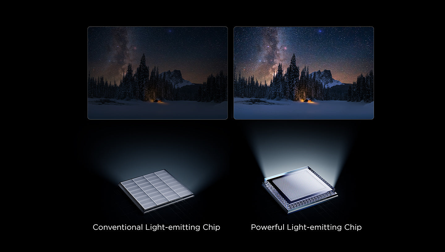 Compared with the previous generation of conventional light-emitting chip, QM7K's ground-breaking Powerful Light-emitting Chip significantly improves brightness and energy efficiency, reproducing natural bright and dark scenes with clarity.