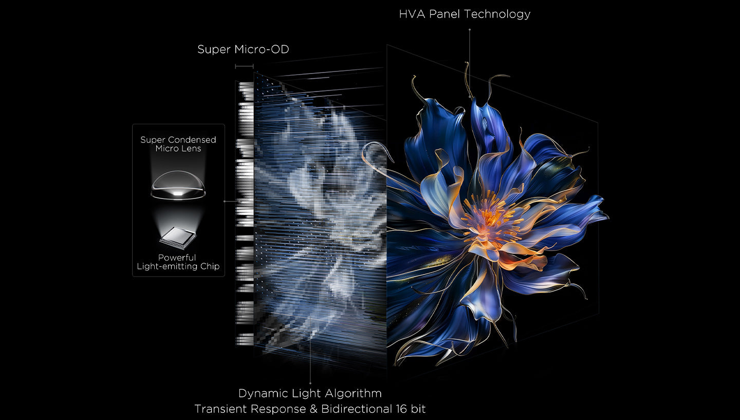 Powerful Light-emitting Chip | Super Condensed Micro Lens | Super Micro-OD | Dynamic Light Algorithm | Transient Response | Bidirectional 16 bit | CSOT HVA Panel Technology