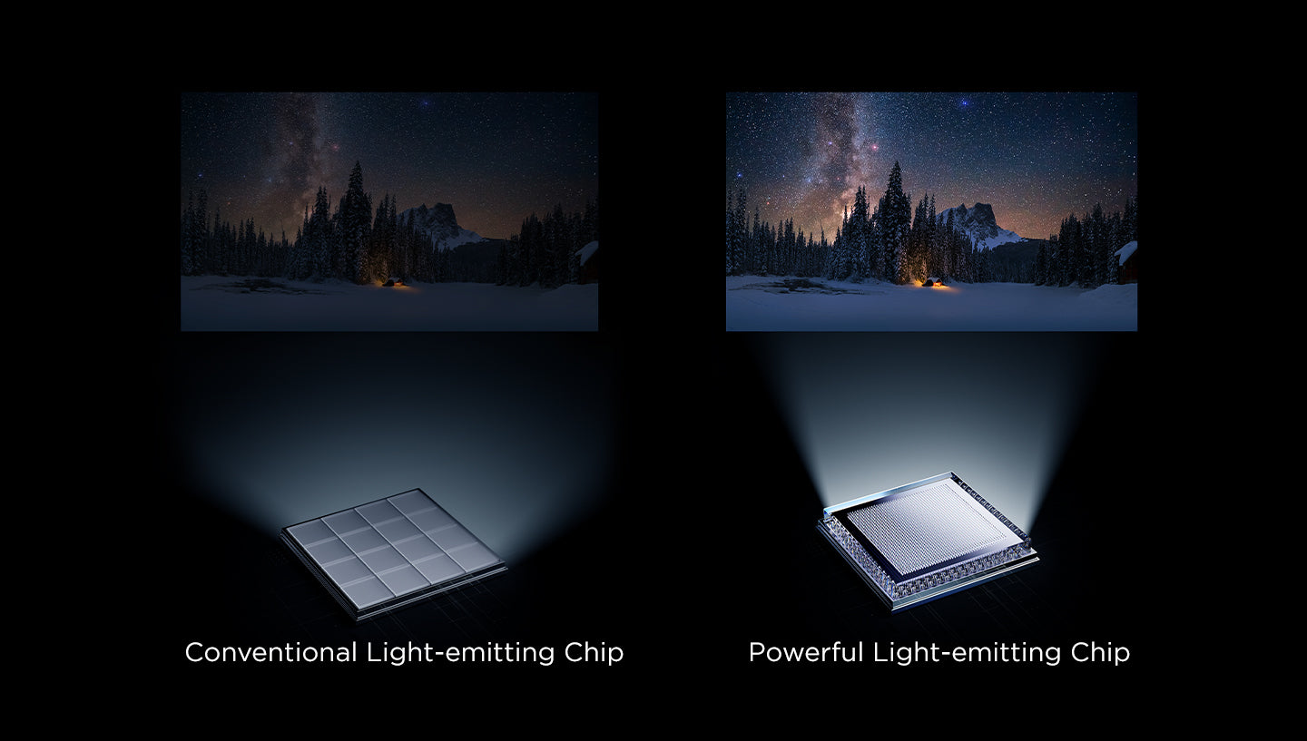 Compared with the previous generation of conventional Mini LED light-emitting chips, X11K's ground-breaking Powerful Light-emitting chips significantly improve brightness and energy efficiency, reproducing natural bright and dark scenes with clarity.