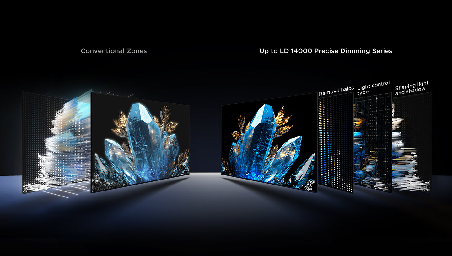 Precise Dimming series refers to Mini LED TV with all-domain halo control technology. The new generation of powerful light-emitting chip , super condensed Micro lens and super Micro-OD make the light shape of individual zones more perfect, and its halo control ability is several times that of ordinary zones. Combined with the CSOT HVA panel with higher native contrast ratio and the world's leading light and shadow control algorithm, Precise Dimming series shapes the real light and shadow so that the TV's comprehensive picture quality performance is dramatically improved compared to ordinary TVs, bringing an upscale image experience.