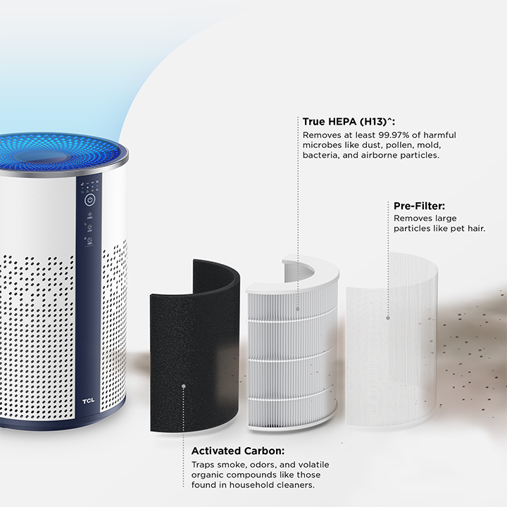 True HEPA (H13) filter eliminates 99.97% of dust, pollen, mold, bacteria, and other airborne particles. -