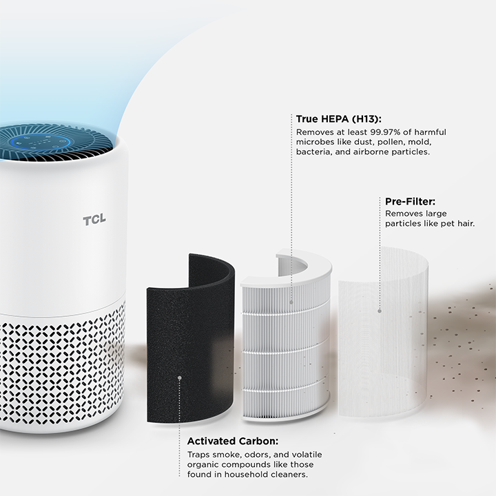 True HEPA (H13) filter eliminates 99.97% of dust, pollen, mold, bacteria, and other airborne particles. -